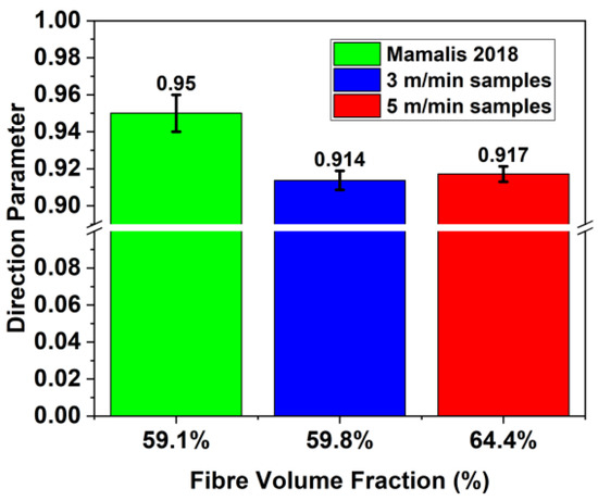 where n is the number of carbon fibre filaments investigated for each micrograph. The direction parameter f indicates how far a fibre deviates from a perfect circle and can be used as a measure of fibre straightness. A total of 75 micrographs were analysed, each containing ≈2000 visible fibres. The number of fibres analysed (n) was greater than 150,000, therefore providing strong analytical results. The estimated direction parameter f for each FVF is shown in Figure 8. For both sample sets, a similar value of f (≈0.91) was obtained, which was influenced by the tensioning conditions during curing. For similar powder–epoxy towpreg and the same fibre type (T700S-24K-50C), an f value of 0.95 was reported for a tensioned system [14]. A lower degree of fibre straightness points to a slight misalignment of fibres caused by the tensioning apparatus, resulting in lower mechanical performances comparatively [14].