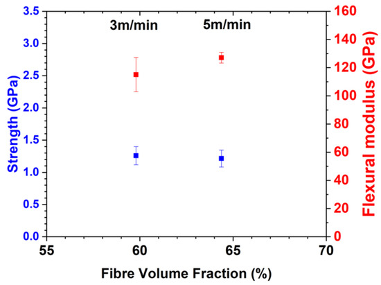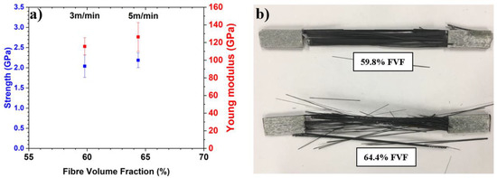 Different production speeds of the towpregging line resulted in different mechanical and fractographic behaviour. The average tensile strength of 59.8% and 64.4% FVF samples were 2039 MPa and 2187 MPa, whereas the average modulus values were 116 GPa and 138 GPa, respectively. As illustrated in Figure 9a, both strength and stiffness increased by 7.24% and 9.28%, respectively, for the higher FVF material, or in other words, with the production speed. Moreover, 64.4% FVF samples exhibited slightly larger standard deviation in modulus (±16.3 GPa compared to ±9.79 GPa), which is believed to be a result of lower homogeneity across the samples due to less consistent consolidation.