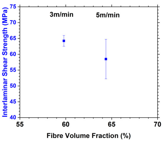 Figure 11 illustrates the change of ILSS of composite plates at different speeds and FVFs. Samples with 64.4% FVF display poorer interlaminar shear strength compared to the 59.8% FVF samples: 64.24 MPa compared to 58.49 MPa (an 8.95% decrease). The void content of 64.4% FVF samples is also higher than the 59.8% samples (32.2% higher void content). The authors believe that bulk porosity is the main contributing factor for the decrease in ILSS at higher production speed. Moreover, the much higher standard deviation (±6.24 MPa) of the 64.4% FVF sample set points to a less consistent consolidation in different samples due to the lack of resin to reach a high consolidation and therefore reduce bulk porosity.