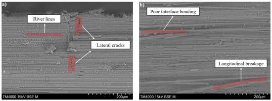 SEM micrographs of fractured samples were compared for both production speeds to visualise the fracture surfaces of the samples. The micrograph of the fractured 59.8% FVF sample (3 m/min) (Figure 12a) describes a homogeneous and brittle fracture: the interfaces show river lines, which are typical of cohesive failure and highlight a good fibre–matrix interfacial adhesion. A lateral fracture can be seen, highlighting a sudden stress release behaviour compatible with explosive failure.