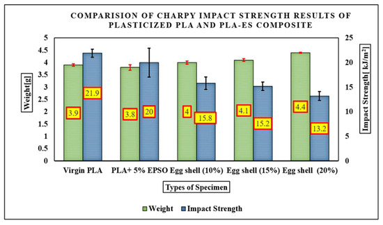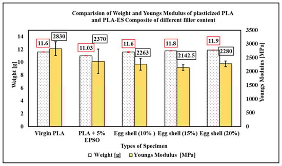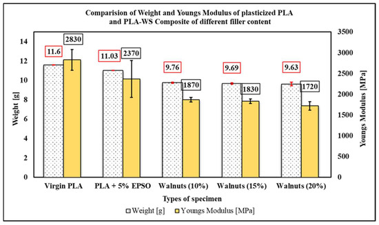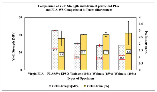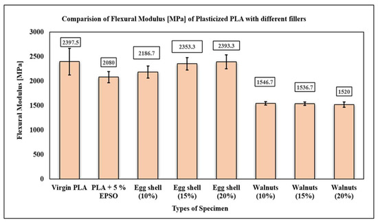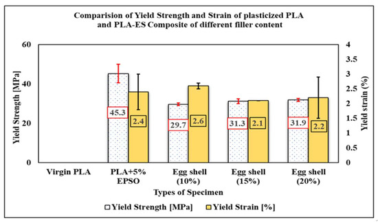 17]. The results concluded that Young’s modulus of the PP-ES composite increases with increased filler content. The optimization of matrix reinforcing with fillers depends on the interfacial interaction between the filler and the matrix, as well as the interaction between the filler and the plasticizer, to improve the properties of the composite. Plasticizers are generally present in the range between 1% to 10% by weight of polymer matrix material. Below 1%, the plasticizer may not effectively plasticize the polymeric material, and above 10%, it tends to leach out of the polymeric material. Epoxidized vegetable oils are considered a feasible alternative for petroleum-based plasticizing materials. Vegetable oils consist of different amounts of triacylglycerols, such as esters of glycerol and fatty acids [
