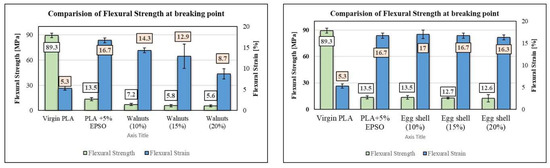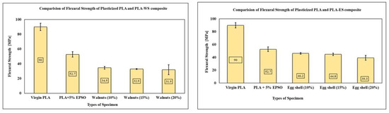 12] prepared a bio composite incorporating pecan nutshells in PLA matrix by melt blending process with (0, 5, and 7.5 wt.%), as pecan nutshells contain polyphenols, proteins, sugars, and lipids; some of these are released to improve the adhesion between the filler and polymer content. Results from the incorporation stated that pecan nutshells also lead to a decrease in the mechanical strength properties, but they have potential application as food trays and disposable items. To obtain better mechanical and physical properties compared to untreated bio composite specimens, the nutshell fillers such as argan and walnuts went through surface treatment methods using silane, alkali, and bleaching [
