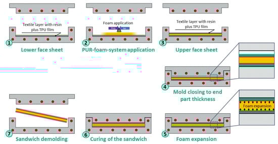 - Behnisch, F.; Lichtner, V.; Henning, F.; Rosenberg, P. Development of a Reactive Polyurethane Foam System for the Direct Sandwich Composite Molding (D-SCM) Process. J. Compos. Sci. 2021, 5, 104. [Google Scholar] [CrossRef]