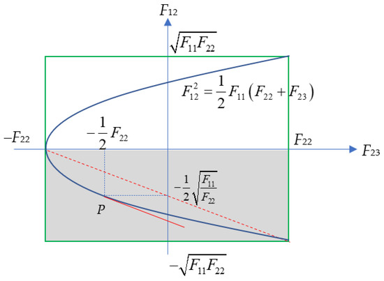 Equation (17) shows F12 as a function of F23, which is a parabola on the F23-F12 plane, as sketched in Figure 1. The domain of the function can be obtained from the first condition in (3). For transversely isotropic materials, it becomes: