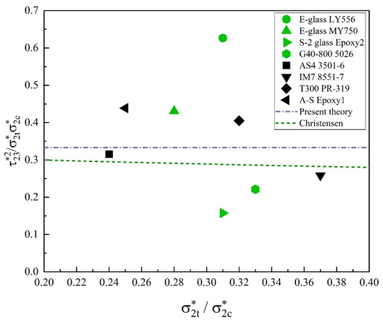 Due to the high variability in the measured transverse strengths, the obtained relationship amongst transverse strengths may not be perfectly represented in the available experimental data. In presence of all three transverse strengths independently obtained experimentally, the transverse shear strength can be employed to validate the relationship in (25), i.e., . The failure criterion can only be as accurate as the agreement between and .