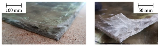 To improve the comparability of SMC characteristics of the SMC preform manufactured by BYK, a fiber weight proportion of 50 wt.% was desired for the manufacturing of the SMC preforms. However, preliminary tests have shown that sufficient distribution of the viscous resin on the glass fiber preform is not possible using the process described in Section 2.2, leading to poor impregnation of the fibers in particular along the preform edges, as shown in Figure 1. In order to ensure sufficient fiber impregnation, the fiber weight proportion of the SMC preforms for the comparative investigation was therefore reduced to 35 wt.%. The resulting properties of the SMC material used in this study are listed in Table 3.