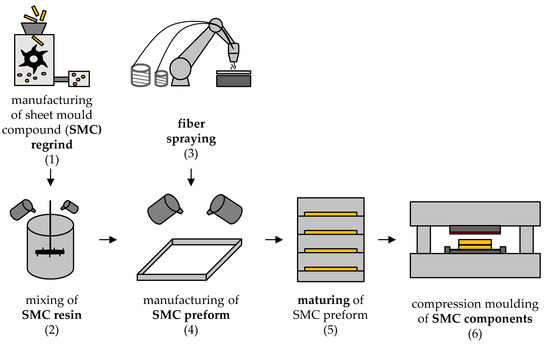 The manufacturing of the SMC components for the experimental investigations of this research can be subdivided into the six steps, as shown in Figure 2.