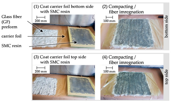 Fourth, the SMC preform was manually laid up. This process can be subdivided into four steps, depicted in Figure 3. The PA carrier foil was coated with the necessary amount of SMC resin (1). Then, the coated carrier foil was turned down and the bottom side of the glass fibers were impregnated with the resin (2) by means of venting rollers. The venting rollers also ensure that the preform is vented in order to minimize the formation of pores in the pressed SMC compounds. Subsequently, the impregnation was repeated for the top side of the preform (3 and 4). The impregnation from both sides was used to achieve a more uniform impregnation of the glass fibers.