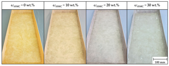 Sixth, the SMC components were compression moulded on an 1800 t hydraulic composite press by Schuler AG, Göppingen (Germany) at Aachen Center for Integrative Lightweight Production (AZL), Aachen. The compression parameters are listed in Table 4. Before each pressing process, a release agent (Frekote 770 NC, Loctite, Düsseldorf (Germany)) was applied to the tool in order to allow easy demoulding of the SMC components. After the carrier foil was removed from the SMC preform, the preform was placed centrally on the pre-tempered tool to ensure an even flow. The outer dimensions of the SMC components are 695 × 295 × 4 mm3 and the edges of the component geometry prevented misalignment of the fibers alongside the edges. After demoulding, the SMC components are cooled for 24 h at room temperature. The SMC components for varied SMC regrind content are depicted in Figure 4. For each SMC regrind content investigated in this work, two SMC components were manufactured and experimentally investigated.
