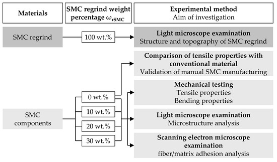 For the investigations of this research, SMC components with SMC regrind weight percentages of ωrSMC = 0 wt.% (reference); 10 wt.%; 20 wt.%; 30 wt.% are characterized in order to detect the effects of an increasing proportion of recyclate. The SMC regrind as well as components with varied mass–weight percentages of SMC regrind are analyzed microscopically. Furthermore, the respective SMC components are comparatively analyzed in regard to the tensile and bending properties.