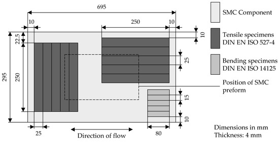 To characterize the mechanical properties of SMC components, tensile tests (DIN EN ISO 527-4) and four-point bending tests (DIN EN ISO 14125) were conducted. As SMC components exhibit flow-induced anisotropic areas alongside the edges due to the pressing process, an area of 10 mm was cut off on all sides [37]. For each investigated regrind content, three test plates were manufactured for the mechanical tests. Ten tensile specimens were extracted from each test plate. Due to the possibly anisotropic areas, five specimens were withdrawn in parallel and five specimens transverse to the direction of flow. Furthermore, five bending specimens were selected parallel to the direction of flow. All test specimens were removed by a water-cooled diamond circular saw according to the sawing plan depicted in Figure 6. The specimens were manufactured in accordance with DIN EN 13421, however, the mold coverage of 50% deviates from the 25–30% specified in the standard. The higher mold coverage was chosen in order to achieve a more homogeneous heating of the SMC preform after inserting into the heated mold.