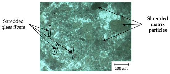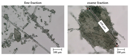 For closer examination, the fine fraction was viewed at 400× magnification and the coarse fraction at 300× magnification, which is depicted in Figure 8. The microscopic image of the fine fraction (left) shows that small matrix particles adhere to the fiber fragments. Furthermore, the fiber fragments differ significantly in length. Small loose matrix particles are also visible. The microscopic image of the coarse fraction (right) presents an example of a matrix-containing particle in which fibers are embedded. The assumption that the maximum particle size by using the fine sieve is 0.7 mm was confirmed by microscopic examination. The fine fraction therefore mainly consists of fibrous particles and small matrix particles, while the coarse fraction is dominated by matrix particles.