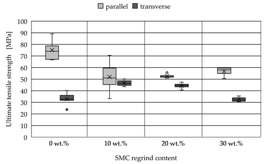 The characteristic values of the samples taken transversely show a different course. The highest tensile strength values were exhibited by the SMC components with ωrSMC = 10 wt.% and 20 wt.%, which achieved similar values. On the other hand, the tensile strengths of SMC components with ωrSMC = 0 wt.% and 30 wt.% decreased to the same level.