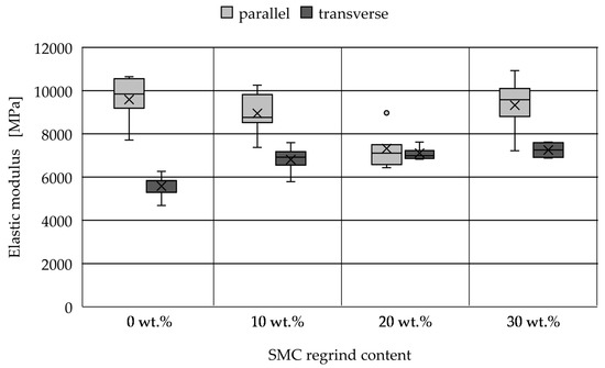 It can be observed that the samples taken in parallel direction show a decreasing elastic modulus. Thus, an increased content of SMC regrind is connected to a reduction in the stiffness of the SMC. In contrast, the SMC components with ωrSMC = 30 wt.% show a similar elastic modulus to the components with ωrSMC = 0 wt.%.