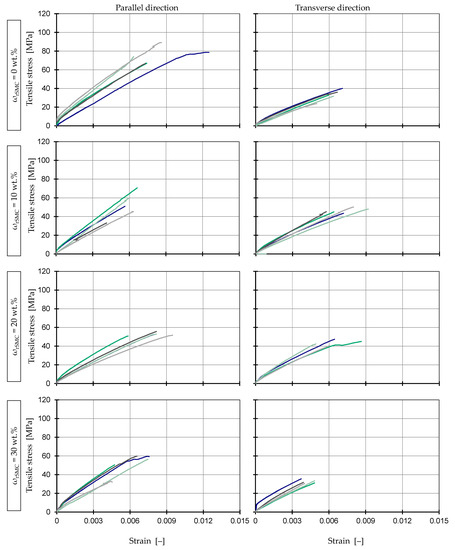 For a closer evaluation, stress–strain curves are depicted in Figure 11. VE-SMC without recyclate content exhibits linear elastic behavior, omitting the degradation of stiffness observed in UP-SMC by Oldenbo et al. at strains of 0.003, and which are attributed to onset damage development in the matrix at this point [25,26].
