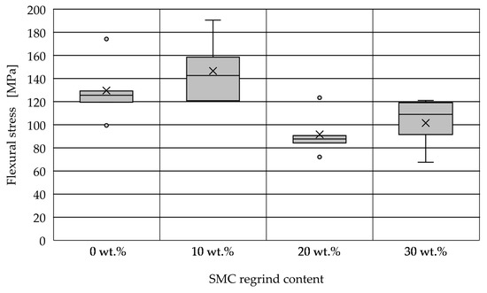 The flexural stress measured by means of the bending tests are depicted in Figure 12. When looking at the flexural stress, it is noticeable that the SMC components with ωrSMC = 0 wt.% and 10 wt.% reach higher breaking stresses than the components with ωrSMC = 20 wt.% and 30 wt%. The SMC with ωrSMC = 10 wt.% demonstrated the highest values, while the SMC with ωrSMC = 20 wt.% shows the lowest values.