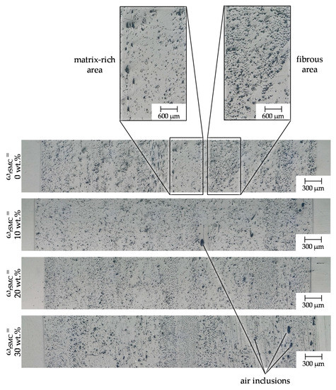 Figure 14 shows micrographs of the cross section over the thickness of the SMC components with varied SMC regrind content. In all micrographs, both fibrous and matrix-containing areas were observed. A homogeneous distribution over the cross-section is not visible in any sample. However, an inhomogeneity is also to be expected in conventional SMC samples [31]. Moreover, no agglomerates of recycled material were visible in any sample, which can be explained by the use of the dispersion disk and indicates a well-homogenized matrix.