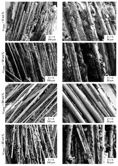 The SEM images of SMC components with varied SMC regrind content are depicted in Figure 15. Two selected SEM images are representatively shown for each content of SMC regrind. The initiation of cracks in composites may occur by fiber/matrix debonding, matrix/filler debonding and at fiber ends alike [25,39,40,41]. In particular, a poor fiber/matrix adhesion can lead to a loss in strength [35,39].