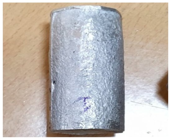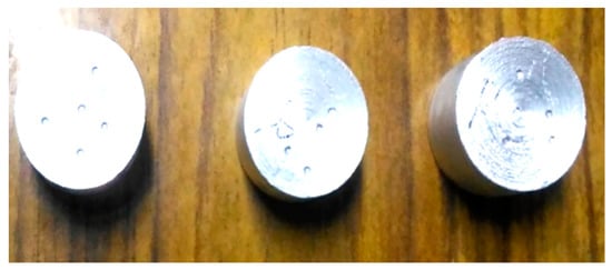 The metal matrix composite (MMC) was fabricated by using an ultrasonic-probe-(USP)-assisted stir casting technique. The fabrication of the composite specimen was carried out using Al-5059 as the metal matrix material and the ceramic materials Al2O3 and B4C as reinforcement particles. The chemical composition of Al-5059 is shown in Table 1. From previous research, it was understood that there is an improvement in the physical and mechanical properties of composite materials when the percentage of reinforcement particles in a composite material is below 20% []. However, this results in a decrease in some properties, like ductility, making the composite unsuitable for some manufacturing processes, like forming. Thus, to keep the composites able to be used in any manufacturing methods, the maximum weight percentage (wt%) of the reinforcement material is 15% in the present research work. In this work, the wt% of reinforcement particles in each of the three fabricated composites was 5%, 10% and 15%. The fabrication procedure for HMMCs has been explained clearly in the literature [,,]. The selected reinforcements were preheated to 500 °C initially. The matrix material Al-5052 was stir cast to 800 °C; once the matrix material is completely converted to liquid form, the required amount of reinforcement quantity (pre-heated) was added into the matrix by continuously stirring and sonicating from the bottom. The three specimens fabricated by varying the wt% of ceramic particles and the metal matrix are tabulated and shown in Table 2. The fabricated composite specimen samples are shown in Figure 1.