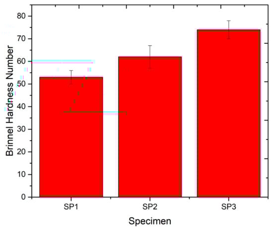 Brinell’s hardness test was performed on three HMMC specimens and the tested samples are shown in Figure 2. The mean of the hardness value of the tested specimens is shown in Figure 3. From the results shown in the Figure 3, the hardness value was greater for the sample SP3, which had a higher content of B4C and Al2O3. The tough interfacial bond between the metal matrix material (Al-5059) and the ceramic particles (B4C and Al2O3) was the cause for the high hardness value of the specimen, SP3. Additionally, the ceramic particle, Al2O3, was the hardest material. This property of Al2O3 could be one of the main reasons for the increase in the hardness of the composite sample SP3.