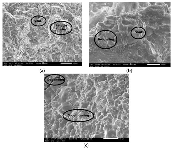 SEM was used to identify the interfacial bonding and fracture behaviour of the composite specimens. In the present work, the three fractured specimens were investigated using SEM. The images obtained using SEM are shown in Figure 5. The graph of SP1, Figure 5a, which has lesser reinforcement content than the other composites, exhibited voids and ridges with closely spaced ceramic particles. The insufficient distribution of the particles in a particular region resulted in the formation of voids. Figure 5b of specimen SP2 shows the formation of good bonding. This indicates that an increased wt% of ceramic particles to the metal matrix restricted the deformation of the matrix. The improvement in the bonding between the metal matrix materials with the reinforced ceramic particles improved the strength of the composites. From these images, it is also observed that the composite specimen, SP3, exhibits more bonding of ceramic particles. Thus, Figure 5a indicates the poor bonding nature of the composite samples which have a smaller percentage of ceramic particles. By contrast, in Figure 5b,c there is an increased wt% of ceramic particles, as evidenced by the good bonding between the ceramic particles and the matrix material. The formation of a particle cluster can be observed in Figure 5a, which is quite common in the MMCs due to improper bonding with the reinforcements, which will lead to the failure of the samples.