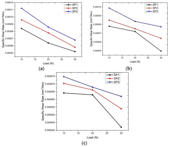 - The SWR of the fabricated specimens decreased with an increase in the load on the specimens. The SWR of SP3 at 30 N load was observed to be 65 × 106 mm3/Nm.