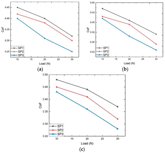Influence of load on CoF at a speed of (a) 500 rpm, (b) 600 rpm and (c) 700 rpm.