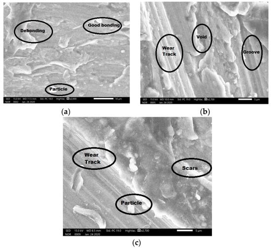 The characterization of the samples was investigated using SEM. The basic aim of the microstructure study on the wear-tested samples is to know the nature of the wear tracks. The images from SEM are shown in Figure 9. From the figures, the wear type observed was abrasive wear. The increase in the weight percentage of the ceramic particles resulted in an increase in the wear resistance of the specimen. This is depicted in Figure 8a–c. The SEM micrographs of all the three fabricated composite samples exhibit longitudinal grooves with some minute partial irregular pits; this indicates an adhesive type of wear in the composite samples. The presence of grooves in the wear-tested composite samples indicates the effect of micro cutting and micro ploughing on the counter-face, whereas the depths or prows are symbolic of adhesive failure of the Al 5059/B4C/Al2O3 hybrid composite []. Figure 9c of SP3, which had a high content of B4C and Al2O3, shows a reduction in wedges and grooves as compared to Figure 9a, which had a high number of wedges and grooves. The surface microscopy following the loading condition displayed particular cracks coupled with continuous grooves when the quantity of reinforcements was increased. The continuous ridges are most likely the source of the asperities’ strong absorption. The abrasion activity in connection to fractured hard reinforcement particles which serve as third layer abrasions could promote action. The surface of a unique composite containing higher reinforcement content shows the production of a complicated wear process that involves macro fractures and debonding wear patterns, and even some segregation particles. A specimen with a lesser amount of reinforcement particles exhibited less wear resistance. Figure 9b exhibits a wedge line along with clusters and voids. This shows a lesser wear resistance compared to SP3. More wear resistance was observed in SP3 when compared to SP2. Ceramic particles restricted the wear behavior of the composite samples; the higher the number of ceramic particles, the higher the wear resistance, since the ceramic particles restrict the composite sample from deformation, which increase the sample’s hardness. Hard material is prone to wear resistance. The lower wear loss is due to a higher reinforcement wt% content, which provides a stronger adhering mechanism between the base matrix and the hard reinforcement particles. As a result, this composition has better hardness characteristics. The utilization of composite materials has increased recently due to the higher wear resistance especially in the tribological applications.