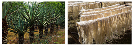 Henequen (Agave fourcroydes), which is a plant-based natural fiber and a native of the Yucatan Peninsula, Mexico, is a long, hard, and strong fiber, which can be industrially obtained from the 90–120 cm long leaves of agave plants, via retting and mechanical decortication processes. Henequen is quite similar with sisal (Agave sisalana) in appearance, but slightly lighter in color and marginally weaker. Henequen fiber has been extensively utilized to make twines, ropes, carpets, and cordages for a long period of time. In addition, it has often been used as reinforcement for making NFRP with thermoplastic or thermosetting polymers, due to its high specific stiffness and strength [5,6,7]. Henequen is composed of approximately 77% cellulose, 4–8% hemicellulose, 13% lignin, 2–6% pectin, and waxes [8,9]. The chemical compositions may be varied to a greater or lesser extent, depending on the henequen plant. Further, the fiber shape and diameter may be varied to some extent, according to the plantation location and the fiber position. Figure 1 displays photos of the henequen plant and the extracted henequen fiber.