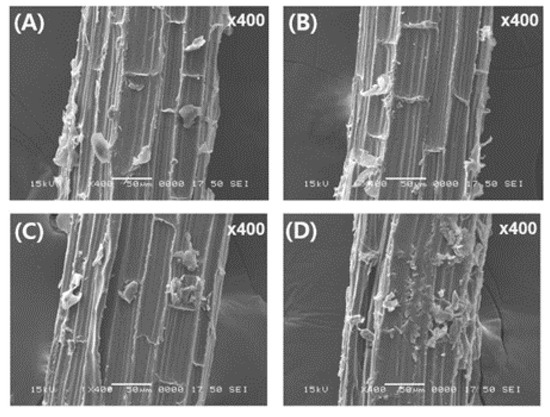 Figure 4. SEM images (×400) of the surfaces of henequen fibers heat treated for different times (A: 0 min, B: 2 min, C: 5 min, D: 10 min).
