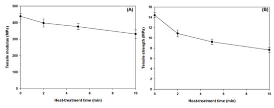 Figure 5. Variations of the tensile modulus (A) and strength (B) of henequen fibers exposed at 235 °C for different heat-treatment times, measured by a single fiber tensile test.