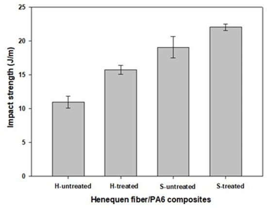 Figure 11. Izod impact strengths for untreated or alkali-treated henequen fiber/PA6 composites produced via different fiber feeding routes.