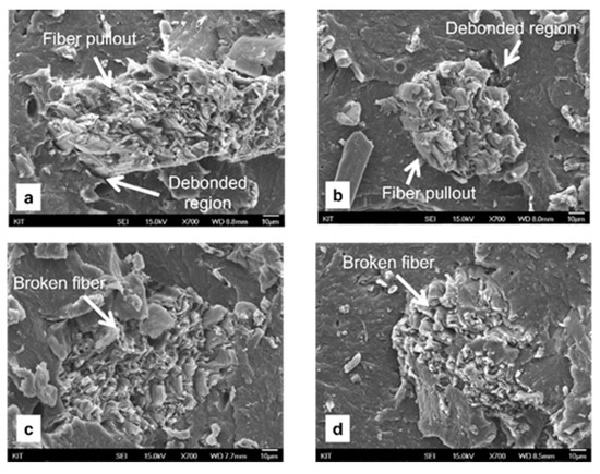 Figure 12 displays the fracture surface topography observed with untreated and alkali-treated henequen fiber/PA6 composites, produced via different feeding routes. The ‘H-treated’ and ‘S-treated’ composites (c and d) exhibited tighter contacts at the interfaces between the henequen fiber and the PA6 matrix than ‘H-untreated’ and ‘S-untreated’ composites (a and b). The alkali-treated composite exhibited relatively flattened fracture surfaces. Further, fiber pull-out and fiber–matrix debonding phenomena were obviously found in the untreated composite. These fracture patterns indicate that the fiber–matrix interfacial adhesion of the alkali-treated composite was stronger than that of the untreated one, as similarly observed in other natural fiber composites [26,27,28,29]. In addition, ‘H-untreated’ and ‘H-treated’ composites (a and c) showed many shortly broken fibers upon composite fracture. It seemed that the henequen fiber, therein, was somewhat damaged during the extrusion process. It may be addressed that the result on the heat deflection temperature, tensile, flexural, and impact properties are quantitatively supported by the fracture surface topography.