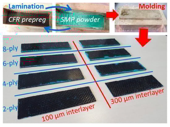 SMPC laminates were manufactured by hand lamination of CFR prepregs and press moulding. Epoxy-matrix CFR prepregs for autoclave moulding (HexPly/M49/42%/CHF-3K by Hexcel) were laminated by interposing an un-cured epoxy powder with SM properties (Scotchkote 206N by 3M). The HexPly prepreg is commonly used for aeronautics; the matrix is an epoxy resin (M49), and reinforcements are in the form of a plain fabric of continuous CFs. These materials were used in previous studies to prototype several composite structures and devices [4,5,6,7]. After curing, the thermoset matrix of the CFR prepregs had very low SM properties and was easily damages during thermo-mechanical cycling. Instead, the SMP epoxy-resin has remarkable SM properties in the shape of film or foam [4,5,6,7,8,9,19,21]. Co-curing of CFR plies and SMP interlayers under compression moulding allows the optimal joining between structural and functional layers.