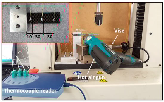 SMP tests were performed using a hot-air gun to heat the samples during the thermo-mechanical cycles. Conventional heating chambers cannot be used because of the long set-up time and low heating rate. This heating procedure is very effective [9], but temperature data for the tests are difficult to be identified, as a temperature distribution is present along the laminate length. A calibration step is necessary for this aim. Generally, the air gun is pointed on the laminate zone where the highest strain has been applied during the memory step. According to Figure 3, for this study, the gun tip was at 60 mm from the clamping end. Temperature calibration was performed on the thickest sample (8 plies and 300 µm of SMP interlayer). The temperature was acquired during time in 3 different positions by type K thermocouples: close the clamping end (A), in the middle-length of the span (B), and close to the free end (C). Temperature curves are reported in Figure 4.