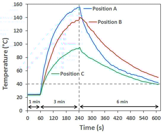 Temperature curves during calibration recorded at clamping end (A), in the middle length of the span (B) and close to the free end (C).