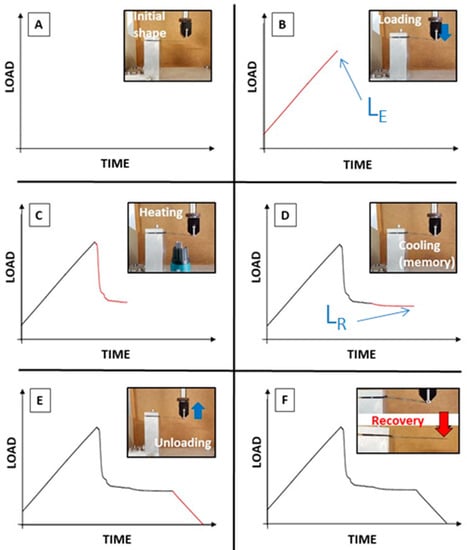 Instrumented thermo-mechanical cycle for SMPC testing. (A) equilibrium condition; (B) deformation under bending at room temperature; (C) heating stage; (D) cooling stage; (E) unloading; (F) free recovery upon heating.