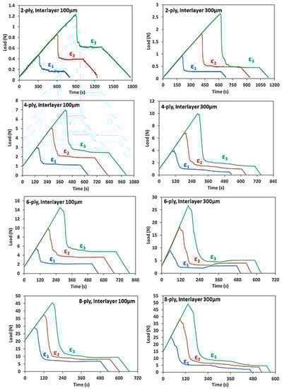 The optimal superposition of the initial “cold” elastic stage shows that previous testing did not affect the laminate structure in terms of fibre crack or delamination. All the curves show the typical shape of a SMPC test with a maximum and a following plateau which is divided in two parts, one at the end of the heating range and one at the end of the cooling stage. As expected, in all the cases apart the 6 ply laminate with 300 µm SMP interlayer, a further load reduction is present from the end of the heating stage and the end of the cooling stage.
