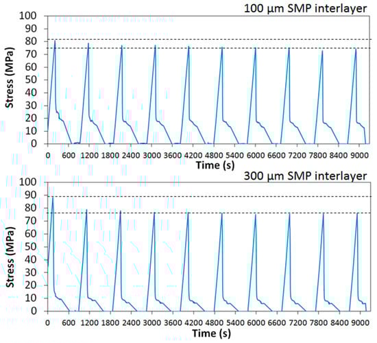 Durability tests were performed on the same SMPC samples, which were already tested at increasing maximum displacement. In this case, the heating time and the cooling time were reduced to 2 min, and 10 continuous cycles were repeated for each laminate by applying the maximum strain of 0.18%. The test rate was increased to 2 mm/min to reduce the full test time, which was limited to a maximum of 3 h, in the case of the thinnest laminate.