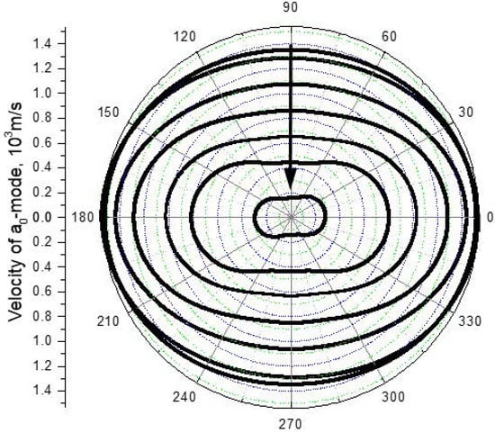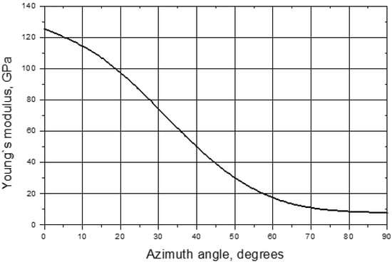 To reveal Young’s modulus anisotropy, the combinations of and , which activate an axial strain and form an identical wave structure similar to that given in Figure 7, were calculated for 10° steps in azimuth angle . The plot obtained is shown in Figure 8; a further increase in the low-frequency axial strain by reducing the frequency weakly affects the E values within few % interval. The results in Figure 8 are in fair compliance with the data obtained in [] and confirm the feasibility of the “identical wave structure” approach for the evaluation of stiffness anisotropy.