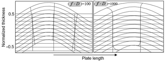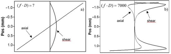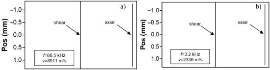 The physical reason for the dispersion of velocity anisotropy is concerned with a frequency-dependent variation in the wave structure. For example, in a low-frequency mode, the axial strain dominates and runs through the whole thickness of the specimen (Figure 3a). Such a strain naturally activates Young’s modulus, which determines the (static) bending stiffness of a plate. As the frequency increases, the wave field is “pushed out” from the interior of the material and the axial strain is diminished while the out-of-plane shear strain enhances (Figure 3b). Material stiffness activated by the high-frequency wave is close to the out-of-plane shear modulus. The frequency-dependent structural transition, therefore, contributes to velocity dispersion of the mode in a selected propagation direction. As a result, the azimuth velocity pattern measured at a certain frequency is affected by the difference in the wave structure, which activates different elasticity on the background of intrinsic material anisotropy. The contribution of the wave structure varies with frequency, thus providing the dispersion of velocity anisotropy.