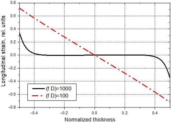In both cases shown in Figure 4, the in-plane displacement is maximal on the plate surface and zero in the middle plane. This provides a similar inhomogeneous depth distribution of longitudinal strain in the specimen (Figure 5). At higher frequencies, the longitudinal strain is displaced from the interior of the specimen to its outer part due to the “skin-effect”. As a result, maximum contribution to bending stiffness for higher frequency modes is expected from the surface plies while the role of the inner plies is diminished. This effect provides an opportunity for the depth-resolved measurements of stiffness anisotropy in laminate composites.
