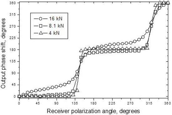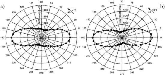 Unlike optically anisotropic materials, where optical birefringence is a well-established field of applications, such an important parameter of ultrasonic waves as polarization is actually disregarded in anisotropy measurements. A strong effect caused by the anisotropic structure of composite materials has brought back interest in studies and applications of ultrasonic birefringence []. The developed applications of ultrasonic birefringence are mainly concerned with stress analysis and closely related to photo-elastic experiments: the stress-induced anisotropy results in splitting of a shear wave into two orthogonally polarized waves travelling at different velocities (acoustoelastic birefringence) [,,]. The difference in velocities was found to be proportional to the difference in principal stresses and was applied to evaluation of external and residual stresses in constructional materials, such as wood and metals [,,].