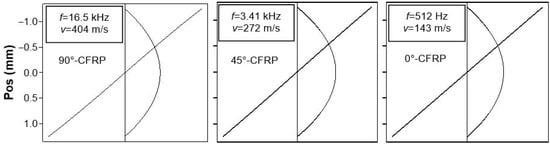 The dispersion of anisotropy was first observed in our experiments in carbon fibre-reinforced plastic (CFRP) [] and also confirmed by numerical calculations. The calculations use the interactive computer program Disperse [], which generates dispersion curves for plate waves in transversely isotropic materials (unidirectional (UD-) composites).