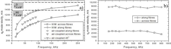 To observe the effect of anisotropy dispersion in the experiment and verify the results of the calculations, the measurements of the phase velocity for zero-order plate waves were carried out in a wide frequency range. Both the air-coupled ultrasound (ACU) [] and wave form imaging (WIM) [] methodologies were used for measurements of modes over (18–250) kHz frequency range. A broad-band excitation (150–900 kHz) by using high-frequency wave piezo-transducers was applied for velocity measurements of the -waves. The specimen studied was epoxy cured 20-ply high-strength CFRP lay-up (weight fibre content 50%; thickness = 2.5 mm) consisting of (2 × 9) unidirectional (0°) carbon fibre plies and two fabric carbon fibre (45°) plies in the middle.