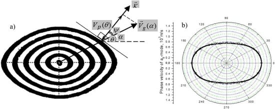 The approaches to be applied for inverse problem of plate wave velocity anisotropy in composite materials include direct analytical calculations [,,] and various versions of the numerical and approximate analytical methods [,]. In this regard, particular questions to be answered are whether and (if yes) how plate wave anisotropy (and accompanying energy flow parameters) depends on frequency. The answers are of primary importance, e.g., in plate wave application for structural health monitoring (SHM) of composite components where the plate waves are used for collecting and conveying information in various directions over a large area of an anisotropic material [,].