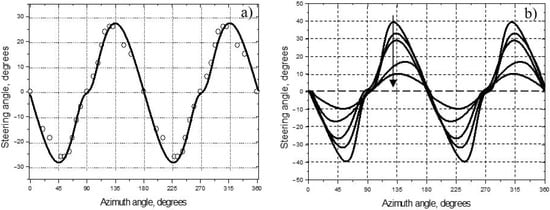 It can also be found as from the WIM experimental data. In Figure 13a, the results of calculations of based on (7) are compared with those derived from the WIM wave front measurements (Figure 12a) for CFRP. Both approaches reveal a strong impact of steering on the propagation of -plate waves in the slanted directions.