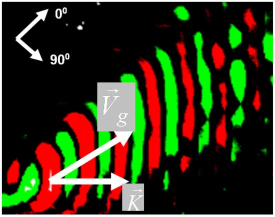 The experimental evidence for the beam steering effect in CFRP is shown in Figure 14. The mode is excited in 2.5 mm-thick CFRP plate with 50 kHz air-coupled transducer; the wave propagates at (−45°) to the fibre direction (wave vector in Figure 14). The wave field on the surface of the specimen is visualized with a scanning laser vibrometer. The image in Figure 14 shows that the energy flux strongly deviates from the propagation direction while the wave phase front remains normal to . The steering angle between and in Figure 14 is measured to be that is in a very close agreement with the calculations in Figure 13b.