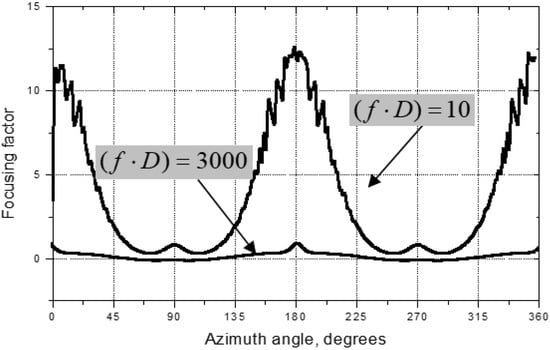 The sign variation of the steering angle in Figure 13 indicates that for any in-plane direction of propagation, the energy flux deviates in such a way in order to stay closer to the fibre direction. Therefore, for the omnidirectional plate wave, the beam steering in CFRP should result in energy focusing in the neighbourhood of the fibre direction. This effect, known as “phonon focusing” [], has been observed in crystalline materials [] and is also predicted to exist in composites []. The energy enhancement caused by non-uniform azimuthal distribution of is characterized by the focusing factor: . Equation (7) shows that this derivative is fully determined by the in-plane phase velocity anisotropy. Since changes with frequency, the phonon focusing for waves will also be frequency-dependent. This is illustrated in Figure 15, where is calculated at different values of parameter. The data indicate that the phonon focusing depends strongly on frequency. The maximum focusing is expected at low when the material anisotropy for flexural waves increases.