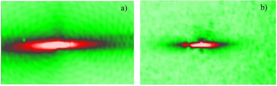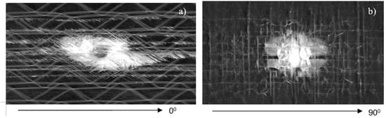 Besides being important for choosing the material orientation to respond to in-service loads, the “stiff” and “soft” directions are relevant for the development of damage in composites, e.g., induced by impacts [,]. The crack opening is shown to be more easily produced in a weakly bonded direction so that impact-induced cracks propagate, predominantly, along a strongly bonded (reinforcement) orientation (Figure 28a). Since the in-plane shear stiffness conforms to the binding force anisotropy, the birefringence can be used to predict orientation of cracking in composite materials. In the bi-axial composite (Figure 28b), the cracking area is strongly elongated along the 90° axis, so that predominant crack orientation also corresponds to the direction of the higher shear stiffness.